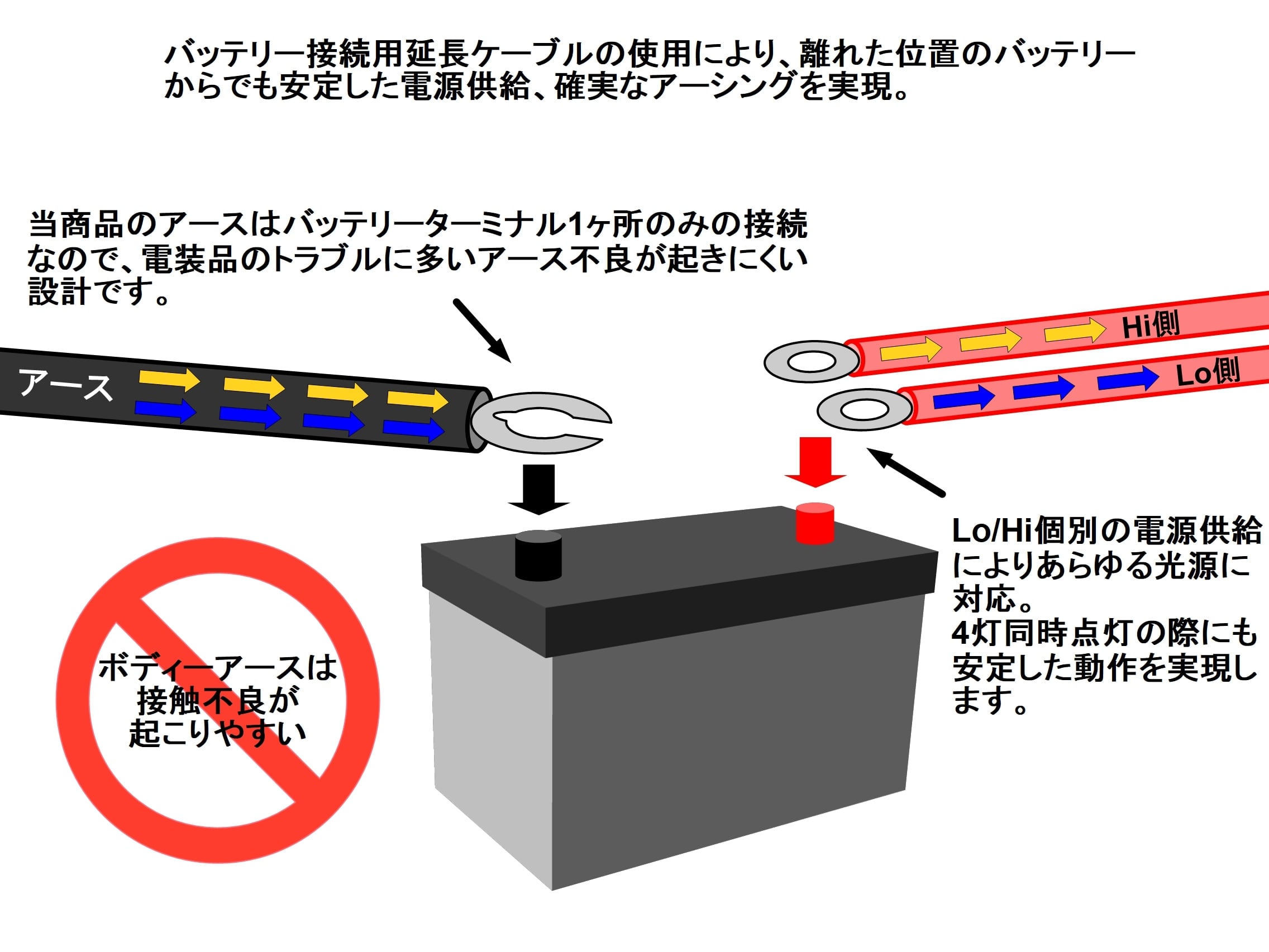 常時電源はLo/Hi個別に供給。当商品はボディアースでは無くバッテリーターミナルに接続する仕様なので、電圧降下を防ぎ安定した動作が可能です。
